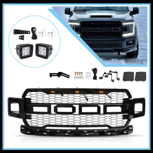 PENSUN Raptor Style Mesh Grille Fit For 2018 2019 2020 Ford F150, Gloss Black W/2 Side Lights